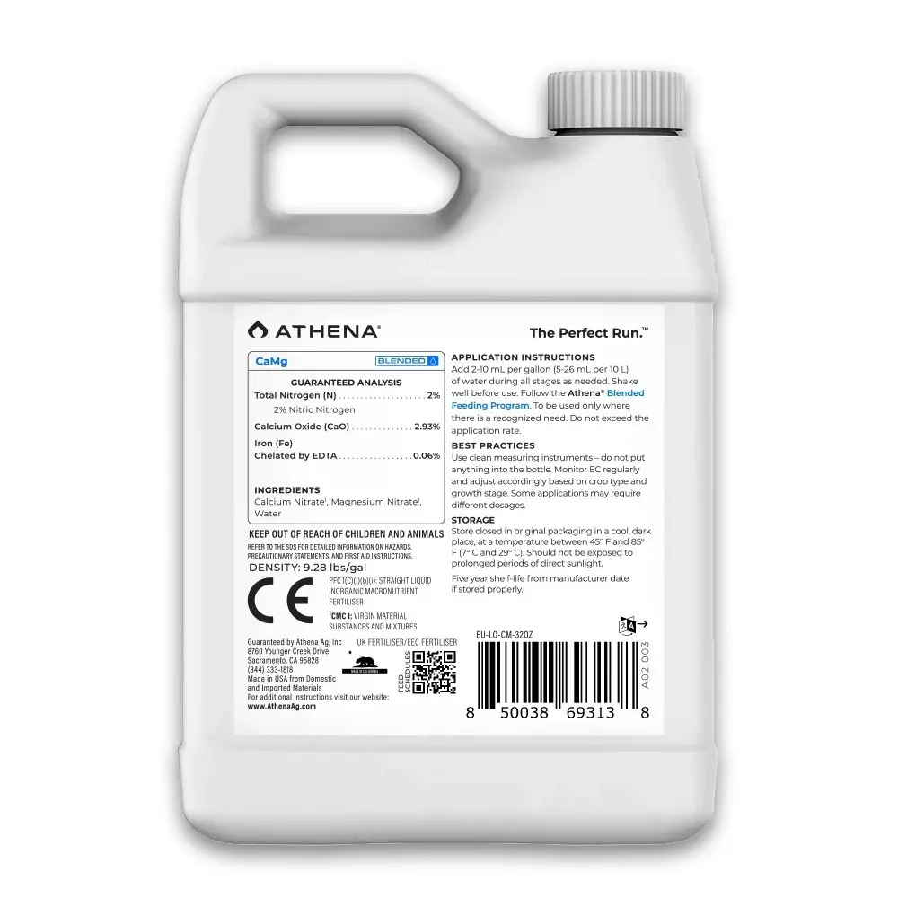 Athena CaMg ist als Ergänzung zu unseren 2-teiligen Flüssigformeln konzipiert. Einige Sorten und Wachstumsbedingungen können während starker Wachstums- und Entwicklungsphasen höhere Dosen an Kalzium, Magnesium, Eisen und Stickstoff erfordern. Dieses Produkt behebt diese häufigen Mängel wirksam, ohne das Gesamtgleichgewicht der Elemente zu beeinträchtigen. In Systemen mit Umkehrosmosewasser (RO) und Pflanzen, die in inerten Medien wie Kokos und Steinwolle angebaut werden, ist Athena CaMg besonders nützlich. Obwohl unsere 2-teiligen Formeln bereits ausreichend Kalzium und Magnesium enthalten, finden einige Züchter eine Ergänzung unter anspruchsvollen Bedingungen hilfreich.