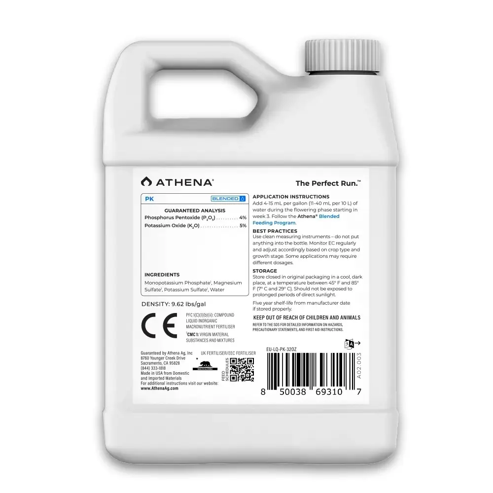 Athena PK ist eine blütenfördernde Ergänzung zu unseren Blütendüngern. Dieser saubere flüssige Booster ist als Ergänzung während der mittleren bis späten Blütephase konzipiert. Athena PK ist ein stickstoffarmer Booster, der zusätzlichen Phosphor und Kalium liefert, die ertragreiche Pflanzen für eine maximale Produktion benötigen. Viele PK-Booster fügen viel zu viel dieser Elemente hinzu und verursachen eine Kaskade von Problemen, wie z. B. eine Verringerung der Verfügbarkeit von Kalzium und Magnesium. Eine ausgewogene Elementbioverfügbarkeit ist in der Blütephase unerlässlich, um die Produktion von ätherischen Ölen und Terpenen zu steigern.