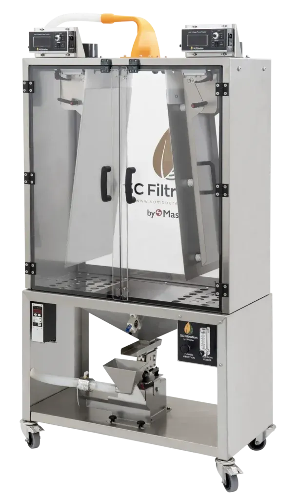 - Hochpräzise Trichomtrennung: Nutzt statische Elektrizität zur selektiven Isolierung der Trichomköpfe von allen anderen Pflanzenteilen. Cannabinoidreiche Partikel erhalten eine negative Ladung und werden von einer positiv geladenen Elektrode angezogen, während Pflanzenmaterial positiv polarisiert und getrennt wird.